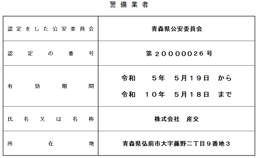 | 主な登録・許可等 | 建築物環境衛生総合管理業登録(中南地域県民局)建築物飲料水貯水槽清掃業登録(中南地域県民局)建築物ねずみこん虫等防除業登録(中南地域県民局)警備業認定(青森県公安委員会)機械警備業務(青森県公安委員会)産業廃棄物収集運搬業許可(青森県)産業廃棄物処分業許可(青森県)一般廃棄物処理業許可(弘前市・平川市・五所川原市・藤崎町・大鰐町)一般建設業許可(青森県)(電気工事業・消防施設工事業) |